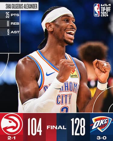 Shai Gilgeous-Alexander va a un solo assist dalla tripla doppia, mettendo assieme cifre spaventose in appena 36 minuti: 35 punti, 11 rimbalzi, 9 assist, 3 recuperi e 3 stoppate per il candidato MVP dei Thunder, che hanno anche 25 punti, 9 rimbalzi e 6 stoppate da Chet Holmgren e 20 da Jalen Williams. I ragazzi di coach Daigneault hanno cominciato come meglio non avrebbero potuto la loro difesa del primo posto a Ovest conquistato lo scorso anno, pur dovendo fare a meno del centro titolare Isaiah Hartenstein