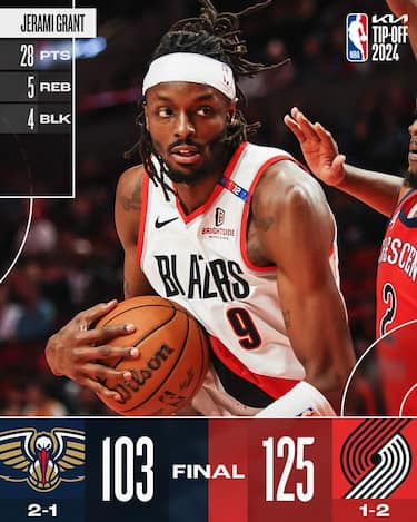 A 48 ore di distanza dalla sfida precedente, i Blazers si prendono la rivincita e vincono nettamente sui Pelicans, a cui non servono i 27 punti dell'ex CJ McCollum complice la serata da 3/14 al tiro di Zion Williamson. I padroni di casa mandano tutto il quintetto in doppia cifra guidati dai 28 di Jerami Grant, i 27 di Anfernee Simons e i 17+12 di Deandre Ayton, dominando a rimbalzo (51-39 con ben 22 rimbalzi offensivi) e prendendosi la prima vittoria stagionale