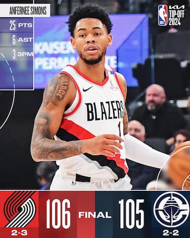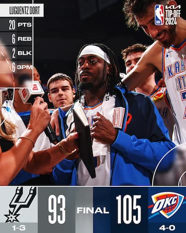Contro San Antonio, i Thunder riescono a superare brillantemente la serataccia al tiro della loro stella Shai Gilgeous-Alexander (18 punti e 7/20 dal campo) e grazie alle prestazioni di Lu Dort (20 punti e 6/8 da tre) e Chet Holmgren (19 punti e 5 rimbalzi) ottengono una netta vittoria. Holmgren tiene anche Victor Wembanyama a soli 6 punti in 27 minuti giocati e per gli Spurs, nonostante un Jeremy Sochan da 17 punti e 9 rimbalzi, la luce si spegne presto