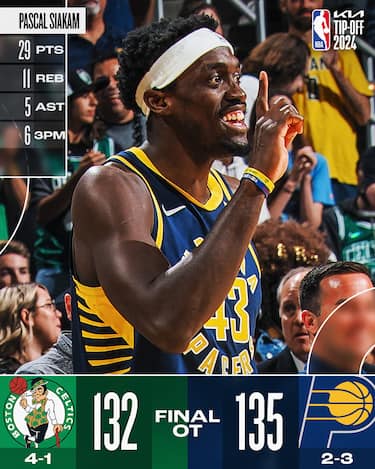 La riedizione delle ultime finali della Eastern Conference regala una partita piena di emozioni e colpi di scena. I Celtics campioni in carica giocano una gara decisamente sotto le loro possibilità, ma rimontano da -19 nel 4° quarto e riescono a guadagnarsi il supplementare. Supplementare dove regna l’equilibrio, rotto solo negli ultimi possessi dall’attacco di Indiana, che trova i canestri decisivi con un jumper dalla media e quindi una tripla su cui c’è la firma di Pascal Siakam (29 punti e 11 rimbalzi). La tripla di Jaylen Brown (25 punti) che potrebbe sancire un ulteriore pareggio e portare ad un secondo supplementare non va, e a festeggiare sono i Pacers