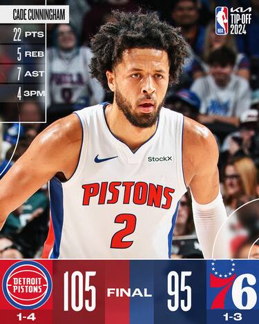 La prima vittoria della stagione di Detroit arriva con un colpo in trasferta a Philadelphia, dove i Sixers, ancora privi di Joel Embiid e Paul George, vanno sotto anche di 21 punti, provano la rimonta guidati dal solito Tyrese Maxey (32 punti e 7 assist) ma riescono solo a ridurre il deficit finale. Il backcourt dei Pistons, con Cade Cunningham autore di 22 punti e Jaden Ivey di 23, approfitta delle disattenzioni della difesa dei ragazzi di coach Nurse. Doppia doppia da 18 punti e 14 rimbalzi per l’ex di serata Tobias Harrisù