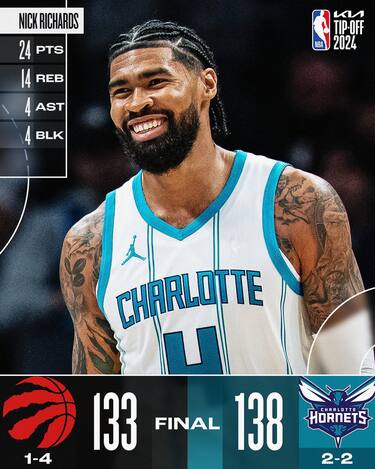 Gli Hornets dominano la prima parte della sfida con Toronto, andando anche a +23 nel primo tempo, si fanno quasi rimontare nella parte centrale della gara, ma riescono comunque a portare a casa una vittoria preziosa con un parziale di 12-0 nel 3° quarto e con le giocate di LaMelo Ball (19 punti e 6 assist) nel finale. A fare la differenza è la panchina di Charlotte, che segna 72 punti complessivi guidata da un ottimo Tre Mann (27 punti). Le note positive per Toronto sono rappresentate da Gradey Dick (30 punti e 11/17 dal campo) e RJ Barrett (31 punti e 8 assist)