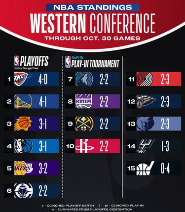 Anche a Ovest c'è una squadra imbattuta e sono i Thunder, primi in classifica davanti ai sorprendenti Warriors. I Lakers, sconfitti dai Cavs, restano al 5° posto e inseguono Dallas e Phoenix