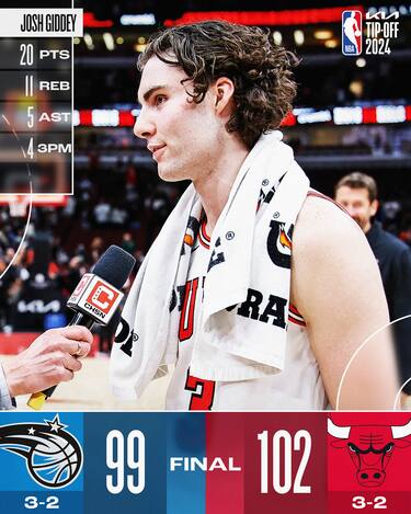 Ultimo parziale decisivo anche nella gara di Chicago, dove nel 4° quarto le due squadre segnano 28 punti totali ed è l’errore finale di Jalen Suggs (17 punti e 6 assist) a sancire la vittoria dei Bulls. I padroni di casa trovano la doppia doppia da 20 punti e 11 assist di Josh Giddey e quella da 18 punti e 14 rimbalzi di Nikola Vucevic. Orlando, sempre in vantaggio durante la prima parte di gara, perde Franz Wagner, uscito nel finale senza più rientrare nella partita, e paga il disastroso 11/46 di squadra da tre