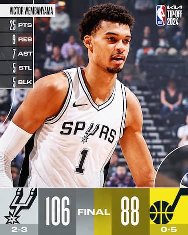 Il tabellino personale di Victor Wembanyama contro i Jazz recita così: 25 punti, 9 rimbalzi, 7 assist, 5 stoppate e 5 palle rubate, ovvero il cosiddetto 5x5. Quello dei giocatori in grando di mandare a referto un 5x5 era un club in cui Wembanyama era già entrato nella sua annata da rookie, ma con la prestazione contro Utah il francese diventa solamente il secondo giocatore nella storia della NBA dopo Hakeem Olajuwon a farlo due volte segnando almeno 25 punti