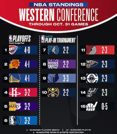 Phoenix vince in casa dei Clippers e si piazza al secondo posto, dietro solamente ai Thunder ancora imbattuti. La vittoria di Memphis su Milwaukee riporta in parità sul 3-3 il record dei Grizzlies, mentre quella di Houston su Dallas mette i Rockets al fianco proprio dei Mavs e dei Lakers
