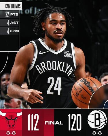 Cam Thomas segna 10 dei suoi 32 punti totali nel 4° quarto e guida i Nets alla vittoria in volata su Chicago. Brooklyn vince la battaglia nel pitturato (66-40 il conteggio complessivo dei punti segnati in area), ma i Bulls restano in partita fino alla fine grazie a Nikola Vucevic (28 punti e 11 rimbalzi) e ai 21 punti a testa segnati da Zach LaVine e Coby White