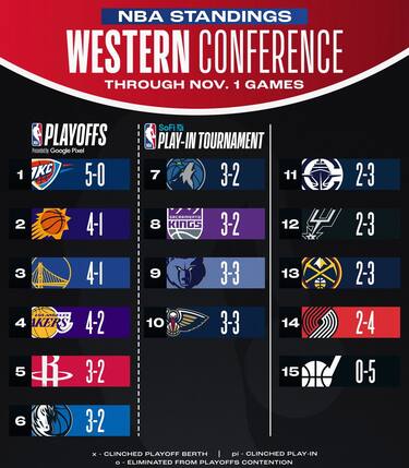 A Ovest l'imbattibilità rimane un'esclusiva dei Thunder, vittoriosi a Portland e inseguiti da Phoenix e Golden State. Denver perde in volata a Minnesota e finisce nella parte della classifica che coinvolge le squadre con un record perdente