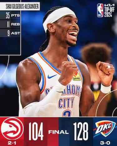 - Arriva l'esordio casalingo stagionale e i Thunder non deludono il loro pubblico, spazzando via gli Hawks. Il protagonista è ovviamente Shai Gilgeous-Alexander, che sfiora la terza tripla doppia della sua carriera, ma la potenza distruttiva della difesa dei Thunder è in bella mostra nel quarto conclusivo, quello che decide la partita. Negli ultimi dodici minuti OKC tiene Atlanta a 6/20 al tiro e doppia gli avversari nel punteggio, 38-19