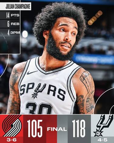 San Antonio torna a vincere dopo due sconfitte in fila e si riporta nei dintorni del 50% di vittorie grazie a una buona ripresa, nella quale non vanno mai sotto nel punteggio legittimando il risultato finale. A fare la differenza è la panchina guidata dai 17 punti a testa di Keldon Johnson e Malaki Branham, con le riserve degli Spurs che accumulano 61 punti contro i 31 di quella degli avversari di serata. Victor Wembanyama riempie il tabellino (12 punti, 8 rimbalzi, 2 assist, 4 recuperi e 3 stoppate) ma senza trovare ritmo al tiro, sbagliando 9 dei 13 tiri tentati. Per Portland ci sono i 21 a testa di Jerami Grant e Deandre Ayton insieme ai 19 di Anfernee Simons, ma davvero poco altro venendo soprassati in classifica dai texani