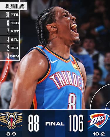 A proposito di difesa: quella dei Thunder approfitta delle mille assenze in casa Pelicans per propiziare una facile vittoria casalinga. Un parziale di 16-0 spacca in due la partita a metà terzo quarto, con Jalen Williams (31 punti) e Shai Gilgeous-Alexander (29) a guidare la miglior squadra della Western Conference. New Orleans non va oltre i 18 punti di Brandon Ingram in una serata da 24 palle perse che cancella anche l’enorme vantaggio a rimbalzo (58-31)
