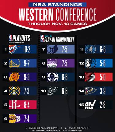 Il ko di Phoenix lascia OKC in vetta solitaria, in attesa della 12^ partita stagionale di Golden State. I Lakers scavalcano Memphis al sesto posto in classifica, ma le distanze rimangono ridottissime in una conference in cui 11 squadre hanno un record del 50% o superiore (con Dallas appena sotto a 5-6)