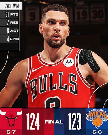 Il domenicano firma la sua miglior prestazione in maglia Knicks con 46 punti e 10 rimbalzi, segnando 18 dei 30 tiri tentati tra cui 6/12 dalla lunga distanza, ma né i suoi sforzi né quelli di Brunson (24 punti) e Mikal Bridges (20) servono ai padroni di casa, sorpresi dai 31 punti di Zach LaVine e i 22 di White per Chicago che si issa al sesto posto nella conference, mentre New York scende sotto il 50% di vittorie (5-6)