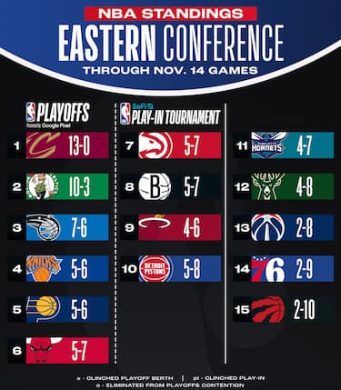Senza partite giocate nella notte, gli equilibri della Eastern Conference rimangono intatti. Cleveland, ancora imbattuta dopo 13 partite, è sola in vetta, mentre Bucks e Sixers sono le vere delusioni di questo inizio di stagione e al momento non farebbero nemmeno il play-in