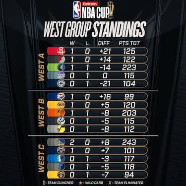 Situazione equilibratissima nei tre gruppi della Emirates NBA Cup relativi alla Western Conference. Battendo Memphis nella notte, gli Warriors diventano l'unica squadra ad avere già due vittorie in classifica