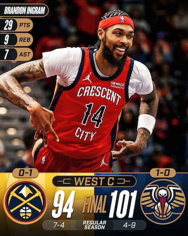Denver arriva a New Orleans senza Nikola Jokic, lontano dalla squadra per motivi personali, e subiscono la voglia di riscatto da parte dei Pelicans, reduci da 6 sconfitte consecutive. Brandon Ingram guida i compagni con 29 punti, 9 rimbalzi e 7 assist, accompagnato da un Trey Murphy III che dopo il rientro sembra finalmente aver trovato una buona forma fisica e chiude con 17 punti e 8 rimbalzi. Michael Porter Jr.(24 punti con 4/7 da tre) è l’unica nota positiva in una serata del tutto dimenticabile per i Nuggets