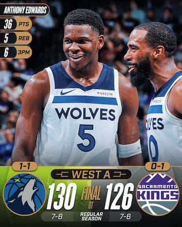 I Kings sfiorano solo il capolavoro nella sfida casalinga contro Minnesota, perché il sogno di suggellare una rimonta partita dal -16 a inizio del 4° quarto si spegna al supplementare. I T’Wolves sembrano aver messo le mani sulla partita, ma subiscono il prepotente ritorno dei padroni di casa e negli ultimi possessi dei regolamentari falliscono per due volte il tiro che chiuderebbe lì i conti. Agli ospiti servono un Anthony Edwards da 36 punti e un Julius Randle da 26 per avere la meglio di una Sacramento che cede solo all’overtime