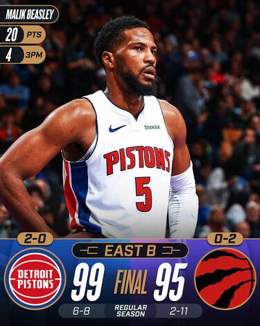 Seconda vittoria in Emirates NBA Cup per i Pistons, che nella prima edizione del torneo avevano collezionato solo sconfitte. Malik Beasley segna 7 dei suoi 20 punti nel 4° quarto, Cade Cunningham aggiunge la doppia doppia da 15 punti e 10 assist, così come Tobias Harris (11 punti e 11 rimbalzi). Doppia doppia anche per Jakob Poeltl, unico a distinguersi tra i Raptors con 25 punti e 19 rimbalzi, ma Torontofinisce per pagare un pessimo 35.7% al tiro dal campo complessivo. Detroit fa poco meglio con il 41.1%, ma basta per ottenere il successo in trasferta