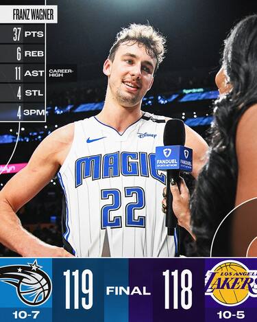 Costano cari ai Lakers gli errori dalla lunetta di LeBron James e Anthony Davis, fin lì quasi perfetti, perché nel finale è la tripla di Franz Wagner a infliggere la prima sconfitta casalinga della stagione ai gialloviola. Sconfitta pesante anche per Minnesota, la 5° nelle ultime 6 partite, che crolla nel 4° quarto a Toronto. Vittorie invece per San Antonio su Utah e per Charlotte, che ha la meglio su Detroit dopo un tempo supplementare. Tutti i risultati e gli highlights della notte NBA