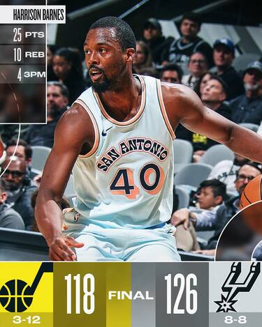 Ancora senza Victor Wembanyama e Devin Vassell, fermi per problemi di lieve entità alle ginocchia, gli Spurs giocano un ottimo 4° quarto e riescono ad avere la meglio di Utah in una partita molto combattuta. Ai Jazz non bastano un Lauri Markkanen da 27 punti e la doppia doppia da 18 punti e 14 rimbalzi di John Collins, perché San Antonio manda ben 8 giocatori in doppia cifra. I protagonisti principali per i padroni di casa sono il veterano Harrison Barnes (25 punti e 10 rimbalzi) e il rookie Stephon Castle (18 punti e 6 assist)