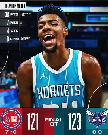 Ci vuole un supplementare per decidere la sfida tra Hornets e Pistons, perché i padroni di casa, dopo essere stati avanti anche di 14 a inizio 4° quarto, subiscono la rimonta di Detroit. I due liberi di Cade Cunningham (27 punti e 10 assist) a 48 secondi dalla fine segnano addirittura il sorpasso degli ospiti, ma la stella dei Pistons deve subito abbandonare la partita per un problema alla caviglia e LaMelo Ball manda tutti al supplementare. Un supplementare deciso dalla stoppata di Brandon Miller sul tiro del possibile, ulteriore pareggio di Tobias Harris (26 punti e 8 rimbalzi) arrivato al suono della sirena finale