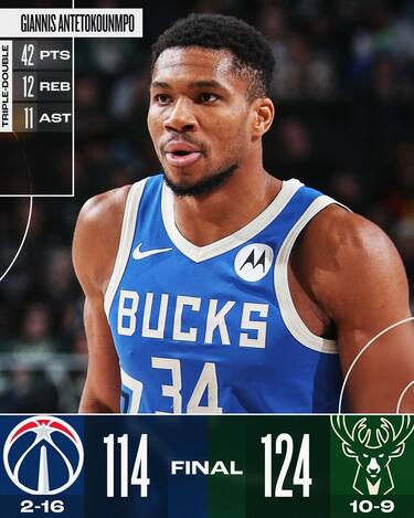 A stabilire la differenza tra Milwaukee e Washington nella vittoria dei Bucks è prima di tutto uno Giannis Antetokounmpo del tutto immarcabile per la difesa degli Wizards. Il greco fa sostanzialmente ciò che vuole, chiudendo con una sontuosa tripla doppia da 42 punti, 12 rimbalzi, 11 assist e 15/24 dal campo in poco meno di 38 minuti