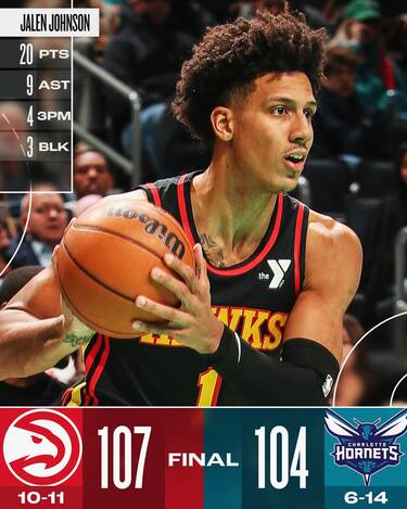 Ancora priva della sua stella LaMelo Ball, alle prese con un problema al polpaccio che lo potrebbe tenere fermo per un paio di settimane, Charlotte se la gioca fino in fondo contro Atlanta ma incappa nella 5° sconfitta consecutiva. Gli Hawks, oltre a un Jalen Johnson da 20 punti e 9 rimbalzi, trovano le prestazioni in uscita dalla panchina di Onyeka Okongwu (16 punti e 11 rimbalzi) e De’Andre Hunter (18 punti), decisivi nel finale dalla lunetta