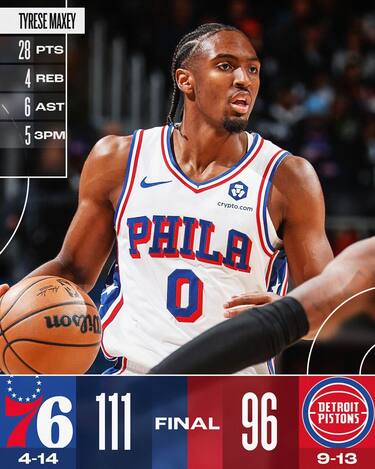 Philadelphia, che anche nella trasferta di Detroit deve fare a meno di Joel Embiid, partono fortissimo, mettendo subito le mani sulla partita e gestendo poi senza troppi problemi. Tyrese Maxey (28 punti e 6 assist) è il migliore per i Sixers, che pescano anche la serata da 17 punti e 5 rimbalzi in uscita dalla panchina di Ricky Council IV. L’assenza di Cade Cunningham pesa per i Pistons, condannati dal 38.5% dal campo e 27.5% da tre di squadra che è specchio di un attacco sempre in difficoltà