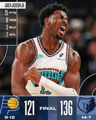 I Grizzlies continuano a vincere e a convincere, conquistando la sesta vittoria consecutiva e salendo al terzo posto nella Western Conference. Coach Taylor Jenkins trova ben sette giocatori in doppia cifra guidati dai 25 punti di Jaren Jackson Jr. e i 19 con 8 assist di un ispirato Ja Morant. I padroni di casa vanno sotto anche di 19 lunghezze in un primo quarto in cui Indiana segna 45 punti, ma poi cominciano a difendere e soprattutto a correre a più non posso, rifilando alla fine 136 punti agli avversari pur senza trovare una serata particolare al tiro (16/46, sotto il 35%). Dopo l'ottimo inizio di partita i Pacers si perdono, anche perché Tyrese Haliburton continua a non funzionare in trasferta: il playmaker di Indiana è l'unico titolare a non raggiungere la doppia cifra fermandosi a 8 punti e 7 assist con 3/10 al tiro, non bastano i 19 di Bennedict Mathurin e i 18 di Pascal Siakam