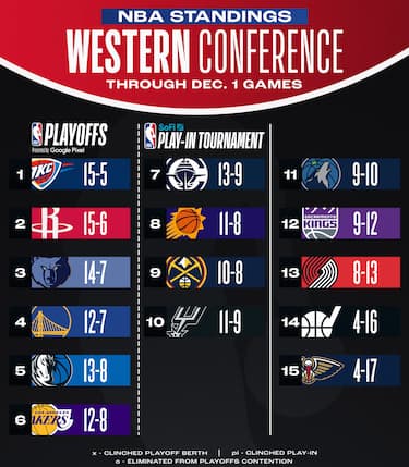 Con il successo nello scontro diretto contro Oklahoma City Houston si porta a mezza gara di distanza soltanto dal primo posto nella conference. Memphis consolida la terza posizione e vincono anche tutte le squadre di vertice, da Dallas (col ritorno di Doncic) alle due di Los Angeles. San Antonio, guidata da Wembanyama, ora incalza Denver (sconfitta con i Clippers) per l'ottavo posto a Ovest