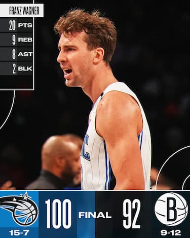 Nets e Magic danno vita a una partita equilibrata in cui nessuna delle due squadre va mai oltre le 10 lunghezze di vantaggio, con ben 16 parità e 20 avvicendamenti nella guida del punteggio, ma alla fine sono gli ospiti a spuntarla per conquistare la 12^ vittoria nelle ultime 13 partite. Franz Wagner con 20 punti, 9 rimbalzi e 8 assist guida un quintetto tutto in doppia cifra pur tirando malissimo (4/17), mentre ai padroni di casa non bastano i 25 del solito Cameron Johnson e i 20 di Dennis Schröder, perdendo la terza partita su tre in stagione contro Orlando