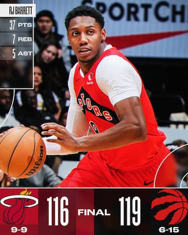 A R.J. Barrett evidentemente piace tantissimo giocare in Canada, davanti al suo pubblico: per la terza volta nelle ultime cinque gare (e la quinta nelle ultime sette), il n°9 dei Raptors mette a segno un trentello, che contro gl Heat è frutto di ottime percentuali al tiro (15/20 dal campo, 3/4 da tre) per un totale di 37 punti, che lo rendono il top scorer dell'incontro. Ma non è l'unico giocatore di Toronto a meritarsi i riflettori: Scottie Barnes, in tripla doppia due giorni fa a Miami, la sfiora nuovamente chiudendo con 23 punti, 10 rimbalzi e 9 assist