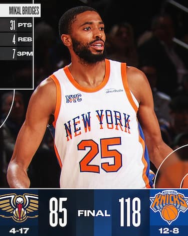 La settima vittoria nelle ultime dieci gare dei Knicks porta una firma importante, quella di Mikal Bridges, finito al centro di mille polemiche per un avvio di stagione fortemente sottotono e addirittura confinato in panchina nell’ultimo quarto della sfida contro Charlotte. L’ex Nets risponde con una prestazione da 31 punti con 12/19 al tiro (e 7/12 da tre punti) per zittire i critici e trascinare New York al successo, in virtù di un primo tempo in cui la difesa dei blu-arancio tiene i Pelicans (sempre decimati dagli infortuni) alla miseria di 28 punti e il 26% al tiro (con 2/20 da tre punti). Bene Towns in doppia doppia con 19 rimbalzi, per New Orleans si tratta dell’ottavo ko in fila (e il 15° nelle ultime 17)
