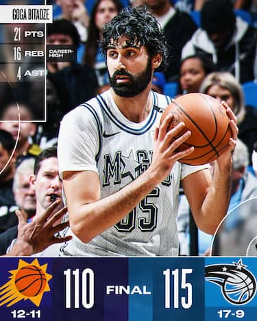 Anche senza Banchero e Wagner, Orlando continua a dettare legge davanti al proprio pubblico vincendo la decima partita su dieci in casa, unica squadra imbattuta di tutta la NBA. Jalen Suggs segna 14 dei suoi 26 punti nel solo quarto periodo e Goga Bitadze ne mette 21 con 16 rimbalzi, tra cui un tap-in offensivo a 13.1 secondi dalla fine che chiude di fatto i conti. Phoenix, sempre più disperata senza Kevin Durant (1-9 il record in assenza di KD), non va oltre i 25 di Devin Booker e i 21 di Tyus Jones