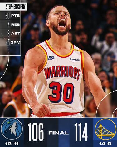 Gli Warriors si prendono la rivincita dopo la sconfitta di due giorni fa sempre contro i T’Wolves, interrompendo la loro striscia di quattro successi in fila. I padroni di casa cambiano marcia con un terzo quarto da 44-32 e poi chiudono i conti con un quarto periodo da 21-16, ribaltando il -9 con cui erano andati all’intervallo e rendendo inutili i 27 punti realizzati da Anthony Edwards per gli ospiti, ringraziando come sempre un meraviglioso Steph Curry