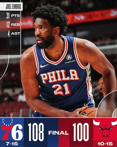 Vittoria preziosa per i Sixers, che ritrovano finalmente i loro “big three”, che a Chicago mettono le mani sulla partita nel 2° quarto e riescono a resistere ai tentativi di rimonta dei Bulls. I padroni di casa tornano poi ripetutamente a due soli possessi di distanza, ma mancano sempre l’affondo offensivo. Serata non fortunata al tiro per Chicago, che chiude con il 40.7% dal campo e finisce anche per essere sovrastata a rimbalzo, dove Philadelphia fa valere la sua maggiore facilità e ha la meglio per 56-35