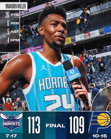 Gli Hornets tornano a vincere dopo otto sconfitte consecutive, ringraziando i due tiri liberi decisivi nei secondi finali di un Brandon Miller da 26 punti, mettendo due possessi di distanza tra le due squadre a 7.2 secondi dalla fine per suggellare la vittoria dei suoi. Charlotte vince la lotta a rimbalzo per 45-29, superando una serata da ben 24 palle perse di squadra grazie ai 18 punti di Vasa Micic e i 14 di Cody Martin, aprendo la crisi degli Indiana Pacers