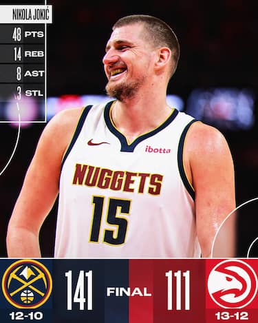 I Nuggets rispondono subito alla pessima sconfitta di Washington dominando una delle squadre più in forma della lega, senza mai andare sotto nel punteggio sul campo degli Hawks. De’Andre Hunter segna 20 punti e Dyson Daniels ne aggiunge 18 per sopperire all’assenza di Jalen Johnson, ma Atlanta dopo essere andata sotto di 20 lunghezze riesce a malapena a tornare a -12 prima di essere rispedita a -32 da un attacco di Denver che gira alla perfezione