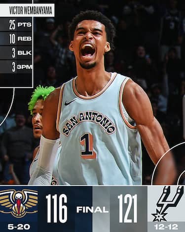 Nella serata in cui Chris Paul sale al secondo posto ogni epoca per assist realizzati (superato Jason Kidd a quota 12.091), gli Spurs tornano a vincere dopo tre sconfitte in fila, superando i 25 punti realizzati da Trey Murphy per una New Orleans sempre più martoriata dagli infortuni e sempre più ultima a Ovest (17 sconfitte nelle ultime 19). Victor Wembanyama deve uscire dopo soli 3 minuti di gioco per un colpo alla schiena, ma torna in campo e chiude con 25 punti tra cui la tripla del sorpasso a 37 secondi dalla fine dopo che un parziale di 13-0 degli ospiti aveva fatto tremare gli Spurs, che si godono anche i 22 del rookie Steph Castle