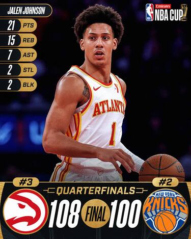 Il crollo nella seconda metà di gara costa ai Knicks le Final Four di Emirates NBA Cup, e la serata storta di Jalen Brunson (14 punti e 5/15 dal campo) e OG Anunoby (13 punti e 5/17 al tiro) pesa sul risultato finale. New York rimane in partita finché la sorregge Karl-Anthony Towns, che chiude con una doppia doppia da 19 punti e 19 rimbalzi a cui aggiunge anche 5 assist, 3 palle recuperate e 3 stoppate che però non bastano per battere gli Hawks