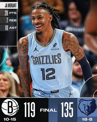 A Memphis, i Nets resistono un quarto, ma già dalla seconda frazione di gioco i padroni di casa accelerano e, pur senza riuscire mettere in piedi una vera e propria fuga, controllano senza troppi problemi fino alla sirena finale. Brooklyn trova addirittura 53 punti dalla panchina, che guidata da Jalen Wilson (15 punti) approfitta del largo spazio concessole da coach Jordi Fernandez. Dall’altra parte a guidare i Grizzlies è come sempre Ja Morant con la doppia doppia da 28 punti e 10 assist, mentre Desmond Bane aggiunge 21 punti con anche 8 assist