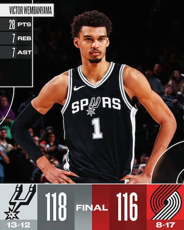 Incassando 46 punti nel solo terzo quarto, gli Spurs si complicano una partita che hanno avuto a lungo sotto controllo: i Blazers infatti, trascinati dai 62 punti della coppia Jerami Grant (32 punti)-Anfernee Simons (30), vanno anche sul +17 nell'ultimo quarto, ma i texani rispondono aggrappandosi al loro totem, Victor Wembanyama, autore di 28 punti, 7 rimbalzi, 7 assist, 2 stoppate e i due liberi decisivi a due secondi dalla fine, in una serata in cui gli Spurs perdono per doppio tecnico e conseguente espulsione Chris Paul già nel primo quarto. Arrivano in aiuto preziosi i 23 punti dalla panchina di Devin Vassell: secondo successo in fila per i nero-argento, quinto ko consecutivo per Portland