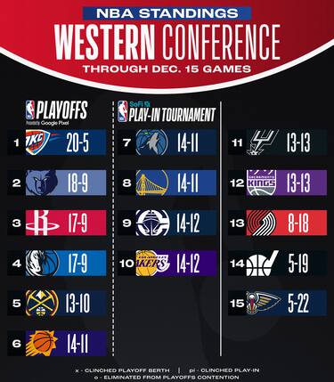 Memphis perde contatto con OKC che ora ha tre gare di vantaggio, mentre Dallas aggancia Houston al terzo posto. Phoenix e Minnesota approfittano del ko di Golden State per riprenderla con un record di 14-11, i Lakers restano aggrappati all’ultimo posto buono per il torneo play-in ringraziando la sconfitta di San Antonio
