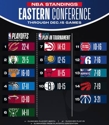 Boston continua a tallonare Cleveland a una gara di distanza, mentre New York vincendo lo scontro diretto si prende il terzo posto ai danni di Orlando. Indiana sale in ottava posizione, mentre Washington è sempre più ultima con un record di 3-21
