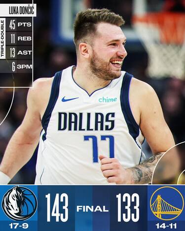 La tripla doppia numero 80 della carriera di Luka Doncic è di quelle da ricordare: lo sloveno firma una prestazione da 45 punti, 11 rimbalzi e 13 assist, toccando quota 40 già nel terzo quarto in una serata in cui tira con percentuali eccezionali (70% dal campo di cui 6/11 da tre punti). Sono le sue magie a propiziare una serata da 60% al tiro per i texani, che oltre ai 29 di Thompson (7/11 da tre) hanno anche 21 punti da Kyrie Irving per infliggere agli Warriors l’ottava sconfitta nelle ultime dieci