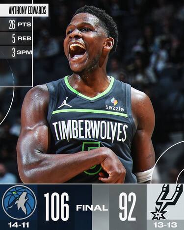 Sono i 26 punti di Anthony Edwards a spingere i ritrovati T’Wolves alla quinta vittoria nelle ultime 7 partite, trovando un ultimo quarto da 30-22 per avere ragione degli Spurs. La difesa degli ospiti torna a funzionare tenendo i padroni di casa al 40% dal campo e il 24% da tre punti, con Victor Wembanyama in doppia doppia con 20 punti e 12 rimbalzi a cui aggiunge anche 5 assist e 7 stoppate, insieme ai 17 a testa di Jeremy Sochan (anche 15 rimbalzi per lui) e Harrison Barnes