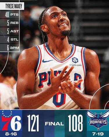 La difesa degli Hornets, tra le peggiori della lega, appare in affanno già dai primi possessi e Tyrese Maxey ne approfitta senza farsi pregare. La guardia dei Sixers, immarcabile per larghi tratti della partita, fa letteralmente ciò che vuole, accelerando a piacere e chiude con 40 punti e 5 assist, tirando inoltre con un ottimo 6/12 da dietro la linea dei tre punti