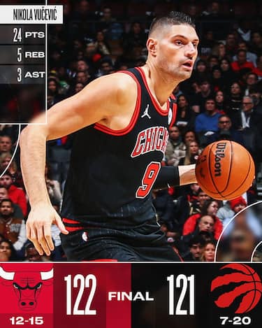 A Toronto non basta un 5-0 nei 14 secondi finali, tutto firmato dal rookie Jamal Shead (10 punti e 6 assist) per evitare la sconfitta casalinga contro Chicago, che fin lì aveva guidato dall’inizio senza troppi problemi. Nikola Vucevic, con 24 punti e 10/17 al tiro, è il migliore tra i Bulls, che trovano anche un buon apporto da Talen Horton-Tucker, che segna 15 punti in uscita dalla panchina, ma perdono Josh Giddey (11 punti, 9 rimbalzi e 8 assist) per un problema alla caviglia nel 3° quarto e non più in grado di rientrare sul parquet