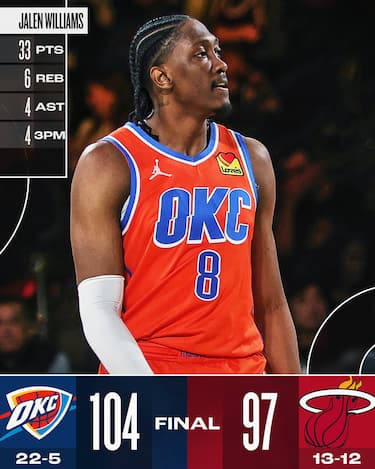 Il ko in NBA Cup non ha invece intaccato i Thunder, che dopo aver vinto ieri notte a Orlando passano anche a Miami in back-to-back allungando a 7 la propria striscia di successi. Un parziale di 10-0 nel terzo quarto permette agli ospiti di mettere la testa avanti senza più voltarsi indietro, rendendo inutili i 28 punti con 12 rimbalzi di Tyler Herro e i 17+10 di Bam Adebayo, che riceve 7 punti di sutura dopo una gomitata nell’occhio involontaria di Jaime Jaquez Jr. La partita di Jimmy Butler invece dura solamente 7 minuti prima di uscire per una indisposizione non meglio specificata (aveva subito una distorsione della caviglia a metà primo quarto)
