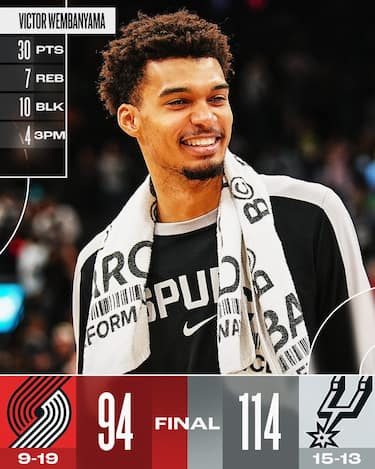 Non che i Blazers, nella trasferta di San Antonio, scendano in campo con particolare aggressività, ma a smorzare le pur minime ambizioni di vittoria di Portland ci pensa comunque Victor Wembanyama. Per la seconda volta nella sua brevissima carriera in NBA il francese va in doppia cifra con ben 10 stoppate rifilate agli avversari, aggiungendo alla sua serata anche 30 punti e 7 rimbalzi in meno di 30 minuti totali giocati